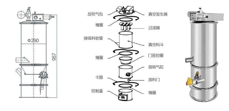 气动真空上料机是利用压缩空气通过真空发生器产生高真空实现对物料的输送,不需要机械式真空泵,具有结构简单、体积小、免维修、噪音低、控制方便、消除物料静电和符合GMP要求等优点。真空发生器产生的高真空,使被输送的物料杜绝了分层现象,保证了混合物料成份的均一性,是压片机、胶囊填充机、干法制粒机、包装机、粉碎机、振动筛等机械自动上料的首要选择设备。